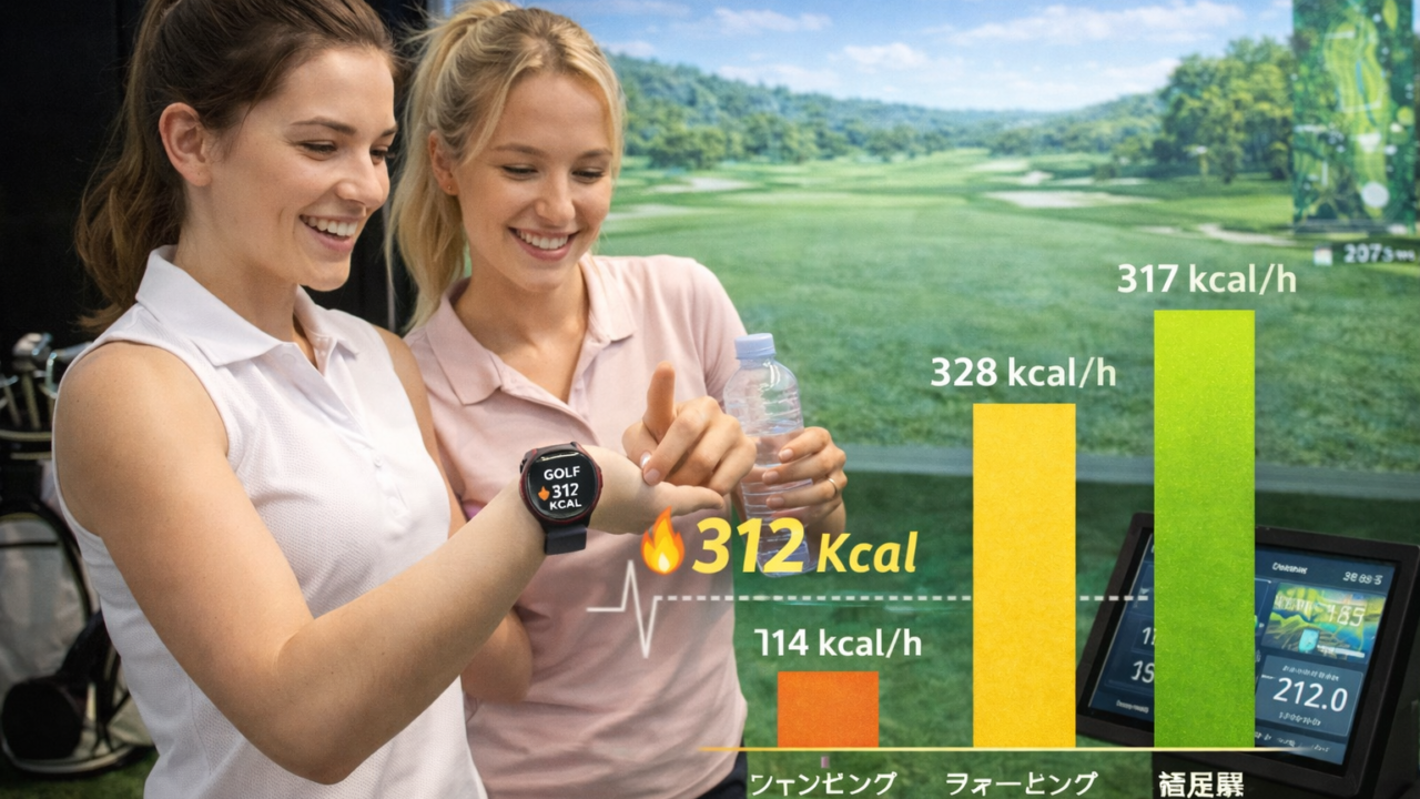 シミュレーションゴルフ1時間あたりの消費カロリーは、体重60kgの方で約200〜300kcalと言われています。これはウォーキング1時間分(約200kcal)と同程度、軽いジョギング30分(約250kcal)に近い運動量です。「座って見ている時間が多い」と思われがちですが、実際にはスイング動作の繰り返しでかなりのエネルギーを消費しています。