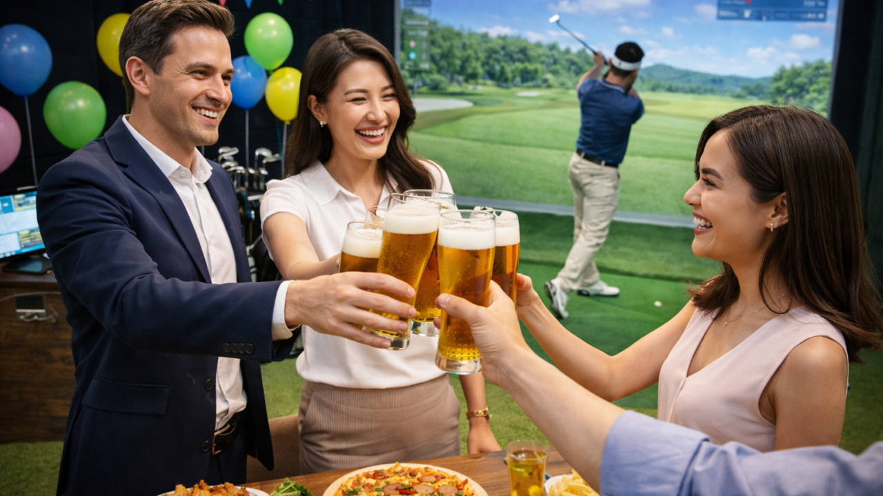 多くのシミュレーションゴルフ施設では、飲食しながらのプレイが可能です。ビールやカクテルを片手にゴルフを楽しむスタイルは、パーティーの雰囲気にぴったり。食事付きのパーティープランを用意している施設も多く、一か所で食べて飲んで遊べる利便性が幹事の負担を軽減します。